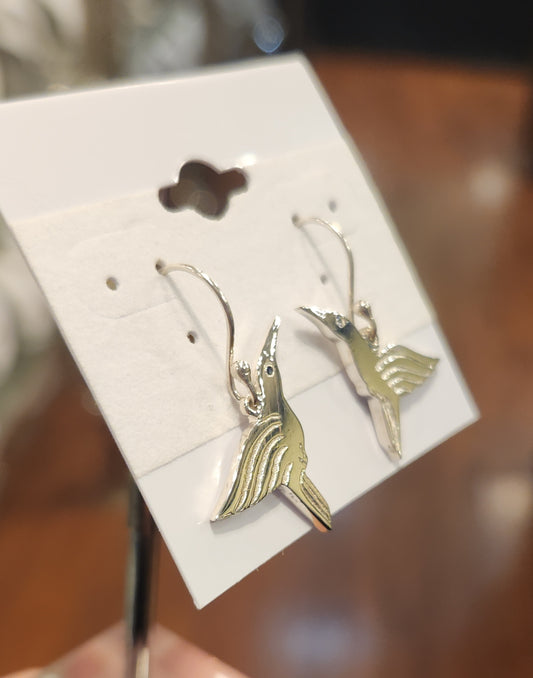 Sterling silver handmade hummingbird earrings with blue sapphires