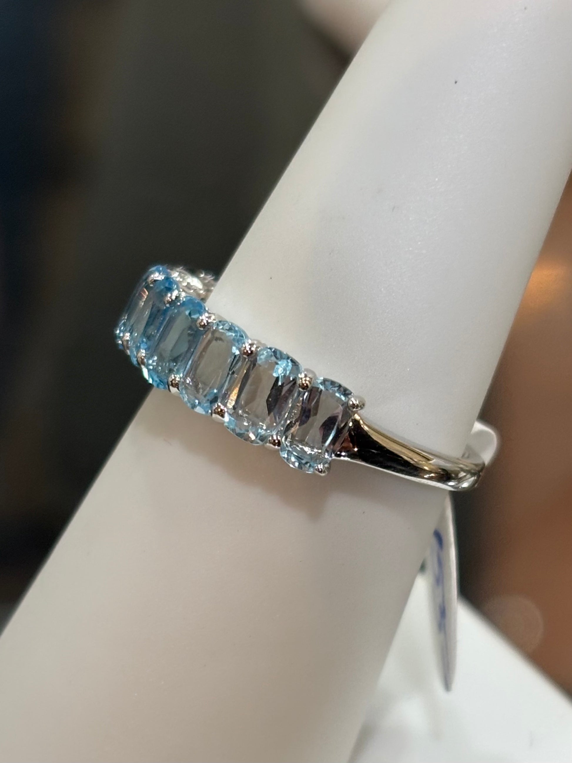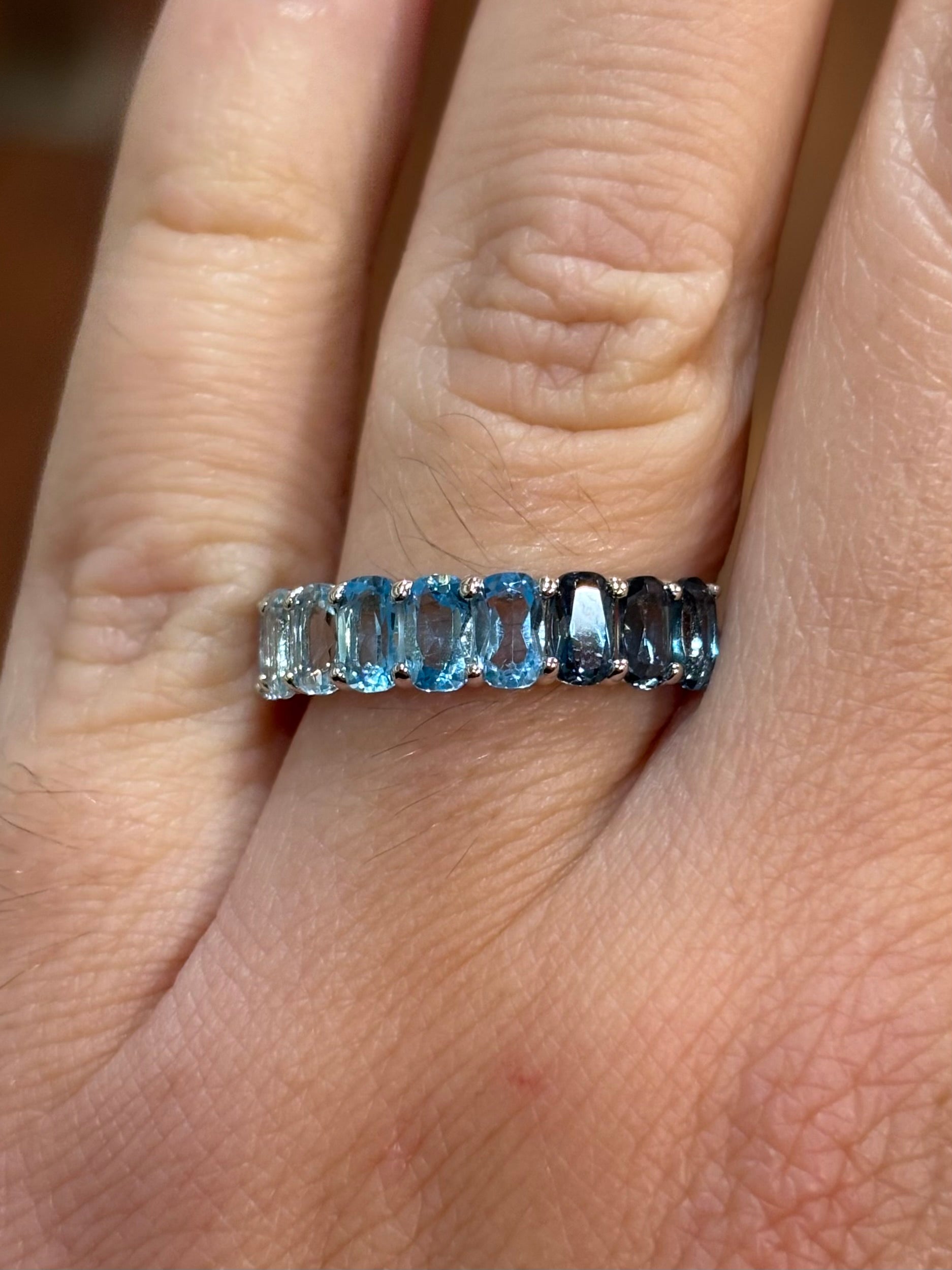 Elevate your collection with this striking sterling silver ring, featuring a carefully curated gradient of blue topaz stones in varying shades. Each stone transitions seamlessly from deep sapphire to pale sky blue, creating a mesmerizing visual journey across your finger. Crafted from lustrous sterling silver, this piece combines timeless elegance with contemporary design.