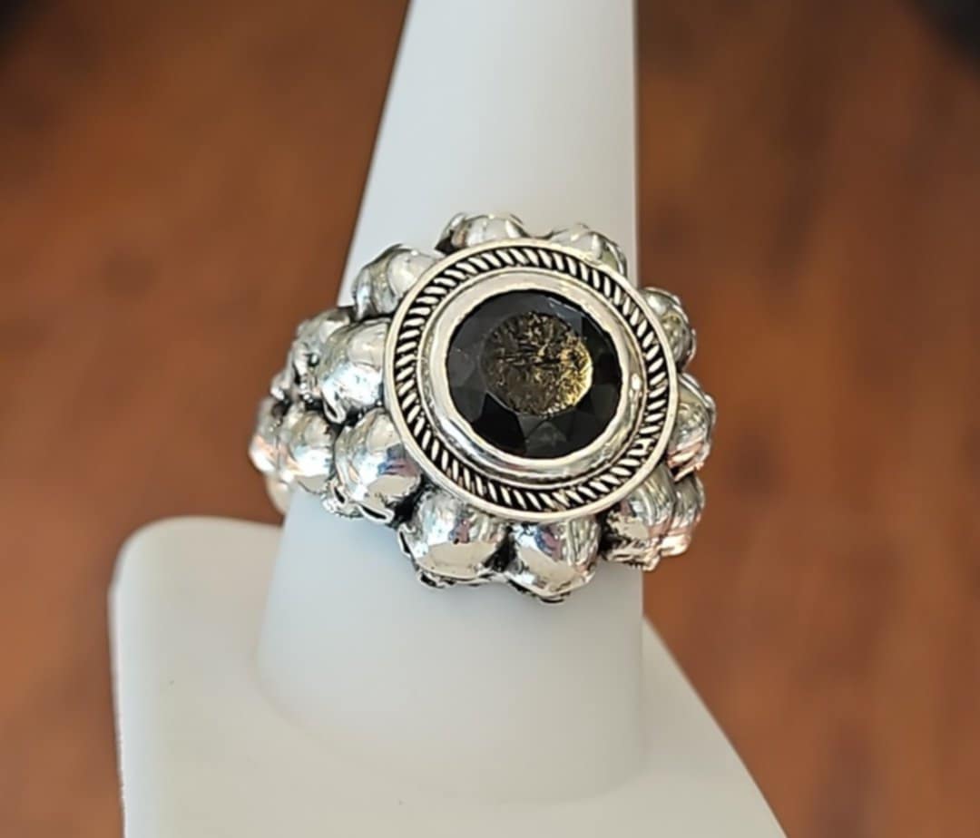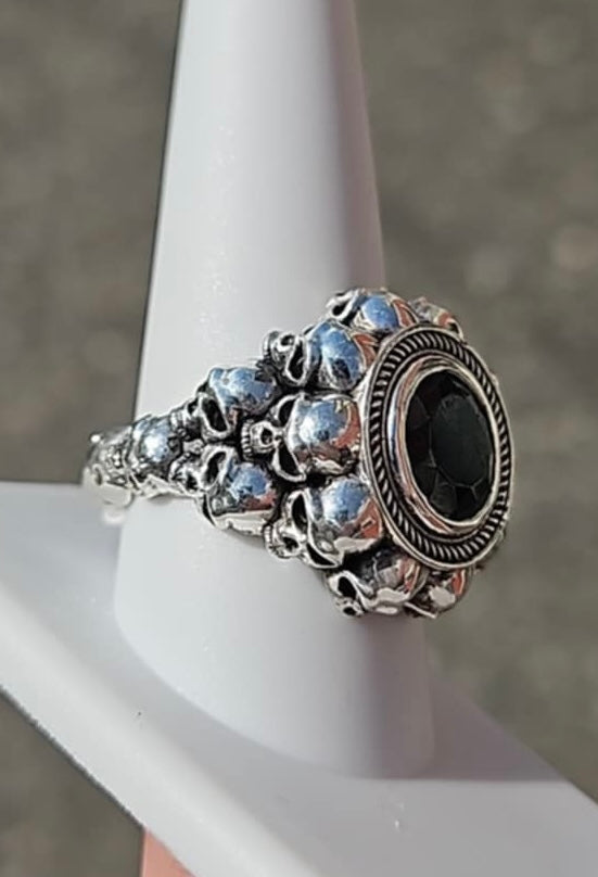 Our Sterling Silver Men's Skull Ring is perfect for those wanting a bold and edgy accessory. Made in-house by our skilled jeweler John R. King, the ring features intricately designed skulls on the sterling silver band. The pièce de résistance is the large faceted round Moldavite stone, adding a touch of mystery and unique beauty to the piece.
