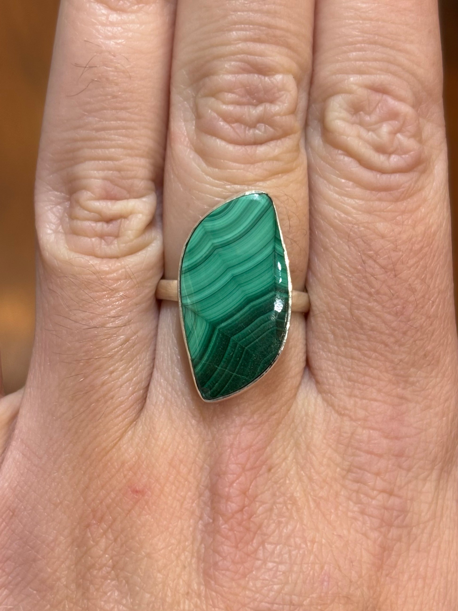 Embrace organic elegance with this striking sterling silver ring, featuring a captivating irregular-shaped malachite stone. The natural banding and rich green hues of malachite create a one-of-a-kind aesthetic, while the asymmetrical cut adds contemporary flair to this timeless design. Crafted from genuine sterling silver, this piece balances artistic expression with refined craftsmanship, making it an ideal statement accessory for those who appreciate distinctive, nature-inspired jewelry.
