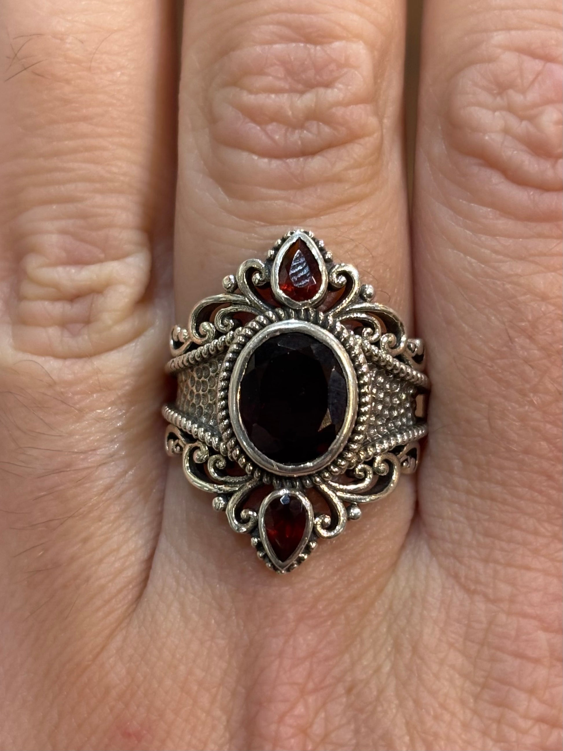 Make a striking impression with this sophisticated sterling silver statement ring. The oval garnet center stone commands attention, beautifully flanked by two delicate pear-shaped garnet accents that enhance its dramatic presence. Crafted with refined elegance, this three-stone design balances bold geometry with graceful proportions, creating a piece that transitions seamlessly from evening wear to elevated everyday styling.